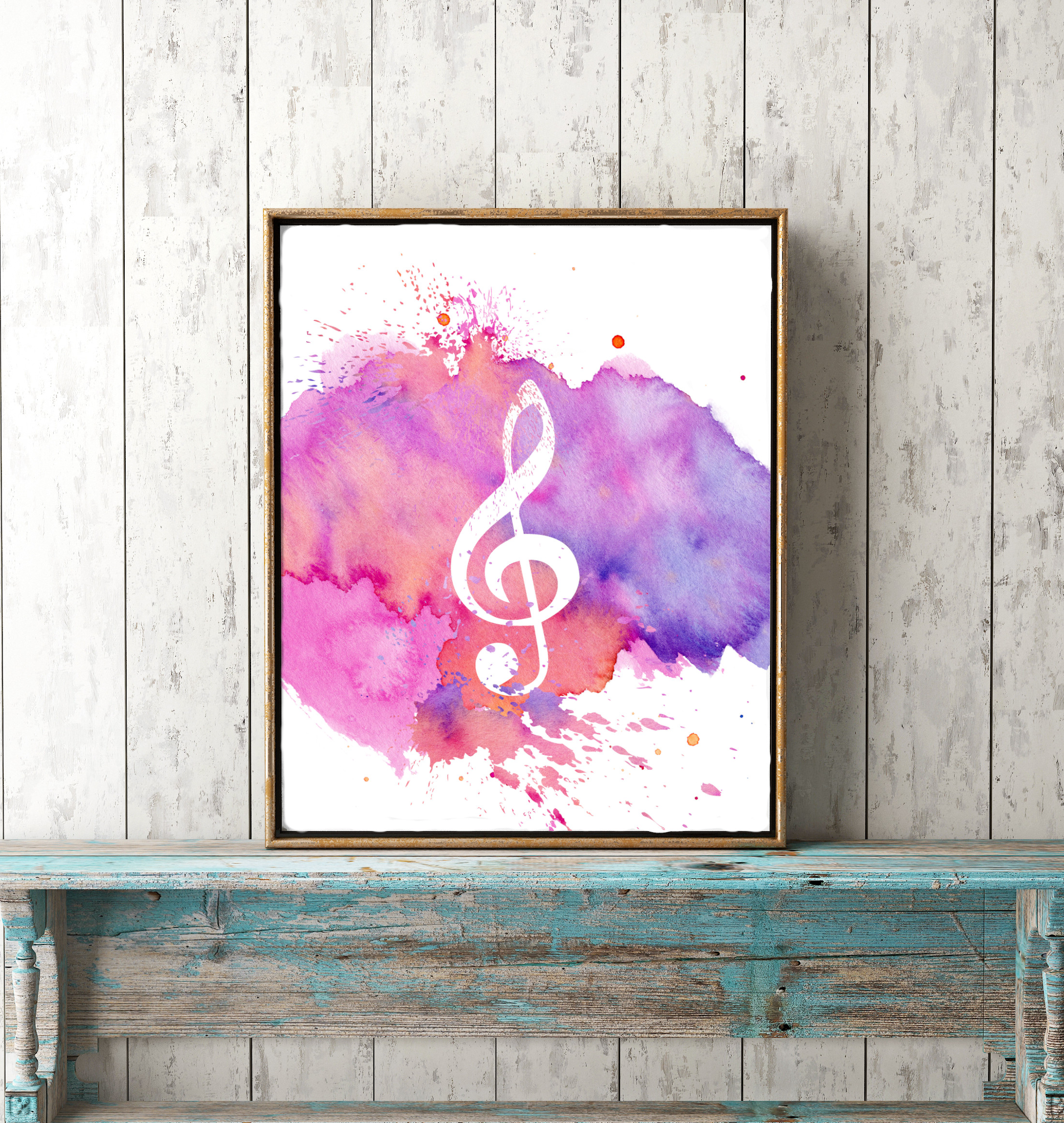 This poster has a treble clef silhouette on a pink watercolor paint splatter background. It also makes a great gift for a musician or teacher. You can hang this printable in a girl’s nursery, room or dorm. Printable art makes it so easy to brighten up your walls!